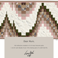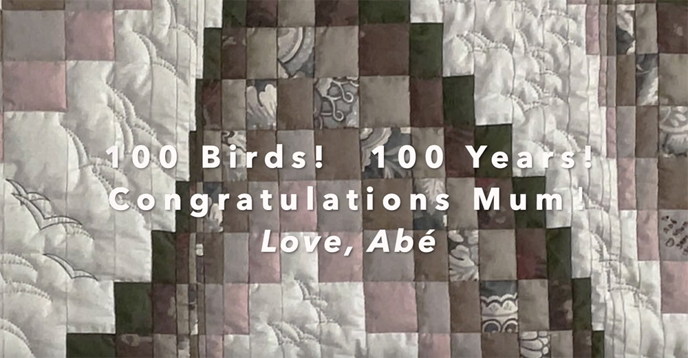 100 Birds (25.5″ x 51″) Dear Mum,100 reflections revealed in 10 of many favourite quilts— one for each decade of your 100 amazing years of a well-lived life. EXPLORE You are…You are a loving, devoted…You and Dad are a beautiful team…Many great memories…More great memories…I will always appreciate…You taught me…Your quilts show without a doubt…You are one of a kind…Do you know…MosaicThank you from Julia Happy 100th Birthday Mrs. Chen! Only an amazing woman could inspire Isabel's tribute—I hope it brings you much joy, Sherle